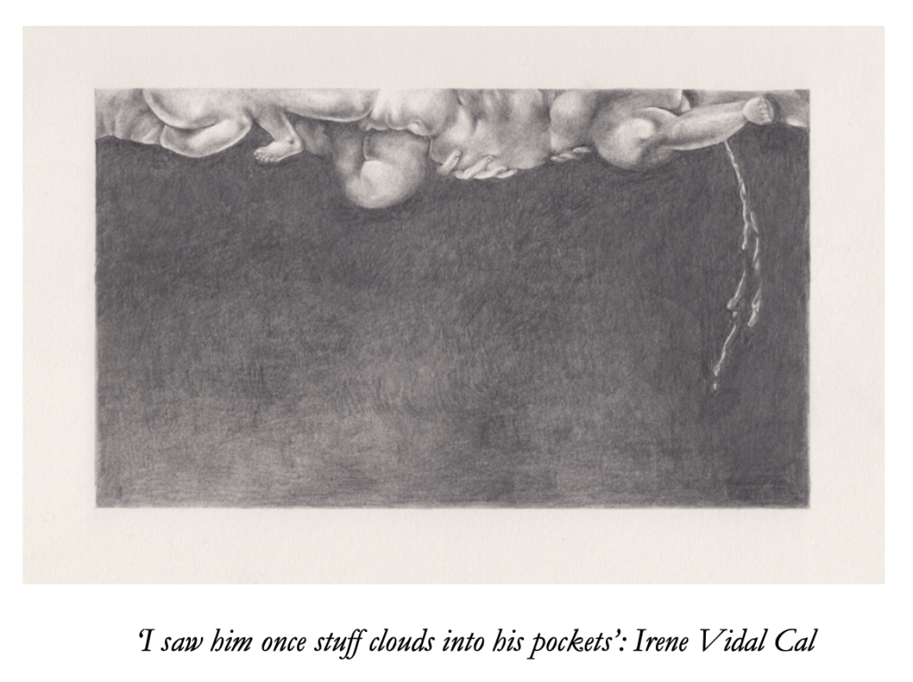 MO: We did indeed, and it was a surprisingly powerful thing to do. I had a couple of colleagues in the curation of the exhibition, the artists Irene Vidal Cal and Charlie Sherratt. Charlie and I decided we’d do a reading of the poem. We took the poem’s 43 chapters in turn, reading continuously over about three hours in front of the images we’d all made in response to it. Festival-goers came and went or sat through the whole thing, as they pleased. I’d wanted to bring The Man Made of Rain into the room in some more tangible way than the 48 lines from the poem displayed within the body of the Night English exhibition, and doing so in this way was really my favourite part of the whole project. Reading aloud in the exhibition space allowed us to celebrate Kennelly’s beautiful, mysterious poem.