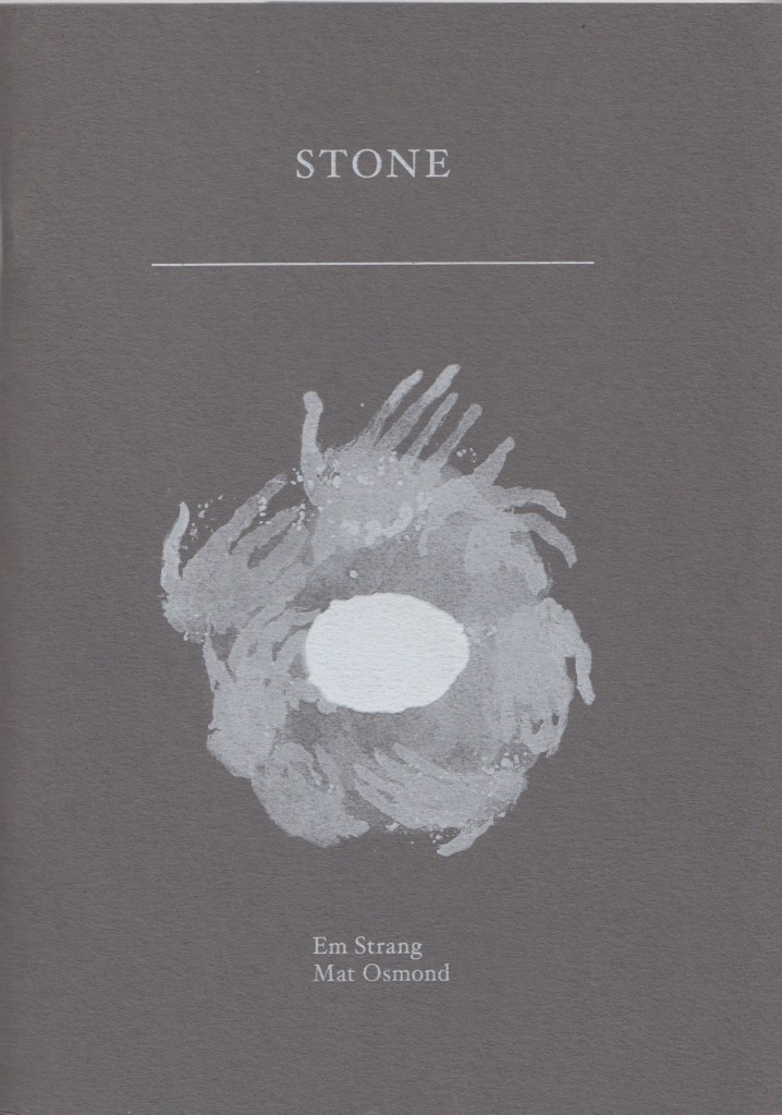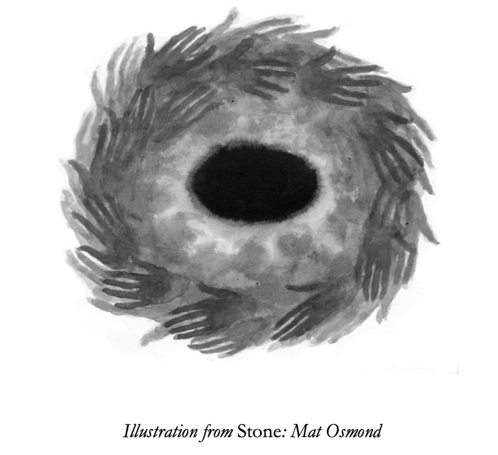 MO: In 2015 I illustrated a book-poem by Em Strang called Stone. I’d got to know Em through The Dark Mountain Project and loved her work. Our collaboration was an unhurried, back-and- forth affair within which Em allowed me complete freedom to decide how I wished to respond to her poem. Having made illustrated chapbooks of my own poetry since 2006, this was my first experience of producing drawings to accompany another person’s words. I was quite thrown at first. The poem’s full of very physical, tangible characters and places. Most of all, it’s full of horses and it felt inappropriate to draw any of that. But at the centre of the poem there’s an enigmatic smooth black stone, one that gets passed from hand to hand and around which the poem’s uneasy atmosphere slowly coagulates. The stone itself was the most compelling and perplexing image in Em’s poem and I decided that I’d use my not understanding that stone as a kind of key to work to. So I began to draw black stones – the same kind of smooth stones I’ve carried around in my own pockets for years.